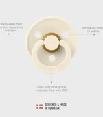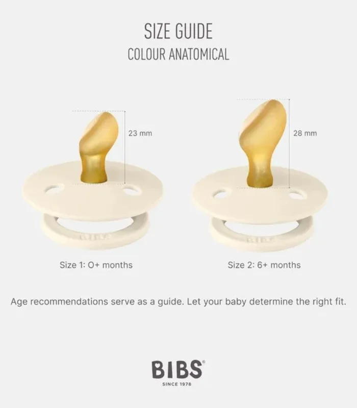 BIBS Colour is the original BIBS pacifier and has been on the market for over 40 years. Colour comes with three different nipple shapes: round, symmetrical, and anatomical. Nipples are available in natural rubber latex. The shield is made of food-grade material – free of BPA. Designed and made in Denmark.
