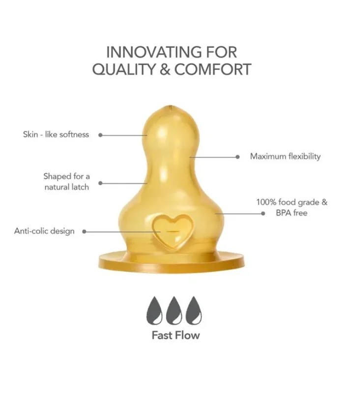 A round latex nipple is claimed by Midwifes to support breastfeeding caused by giving the baby the correct sucking technique. Most like the breast – gives comfort to the baby.
