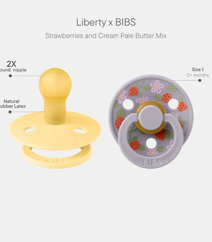 BIBS Round Nipple Pacifier X Liberty 2 Pack Colour Strawberries And Cream Latex Size 1 Pale Butter Mix
