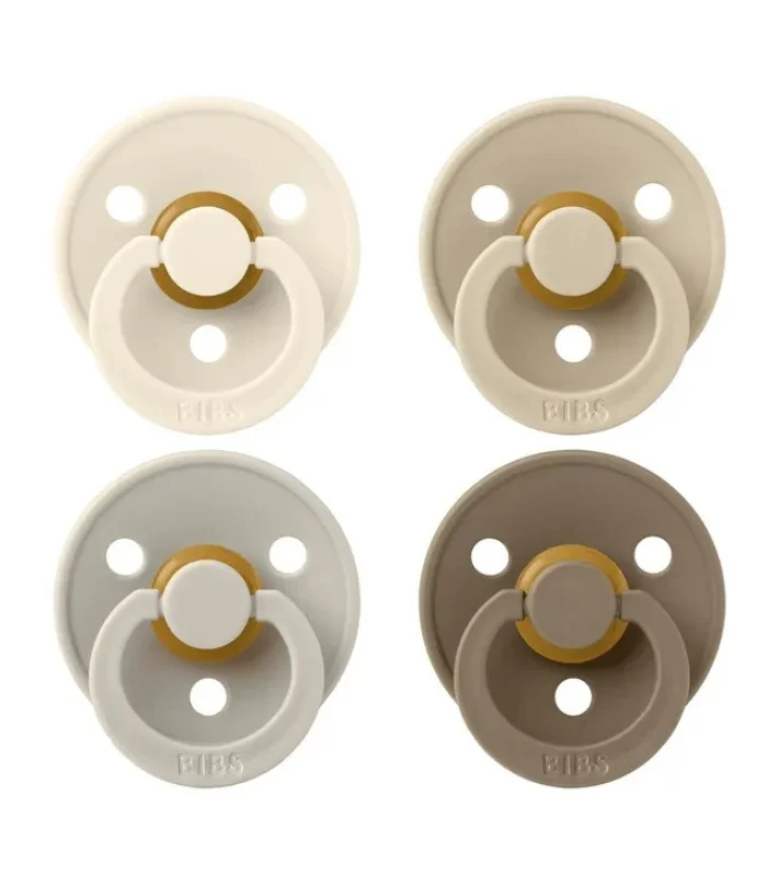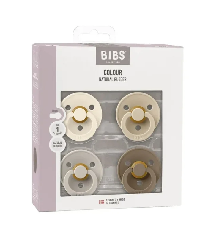 The BIBS Pacifier Colour 4 PACK for babies aged 6-18 months (Size 2) comes with a variety of chic and neutral colors. These pacifiers are designed for comfort and practicality, with soft latex nipples and orthodontic features. This pack gives parents a range of color options to suit their style preferences while ensuring their baby has the comfort they need.