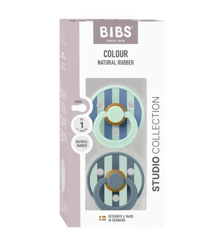 This pack of BIBS Pacifiers Studio Colour 2 PACK is intended for newborns and infants aged 0-6 months (Size 1). They feature the same design and high-quality material as the Size 2 options but are sized for smaller babies. Made from soft latex, the pacifiers offer comfort and support during the early months.