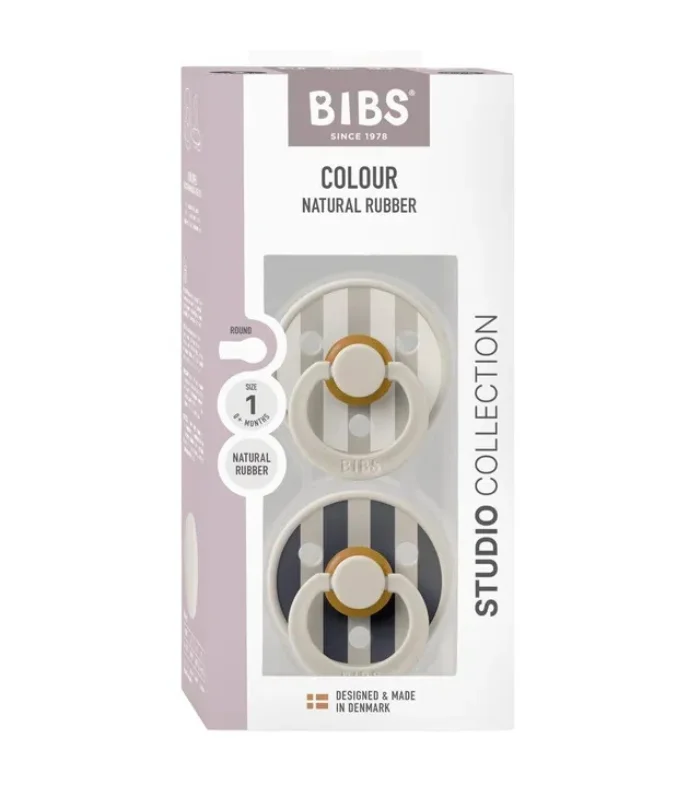 This pack of BIBS Pacifiers Studio Colour 2 PACK is intended for newborns and infants aged 0-6 months (Size 1). They feature the same design and high-quality material as the Size 2 options but are sized for smaller babies. Made from soft latex, the pacifiers offer comfort and support during the early months.