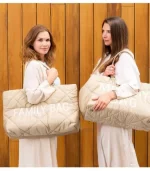 This puffered version has an extra stylish look due to the embroidered words. Furthermore, the lining has the same colour as the outer fabric.